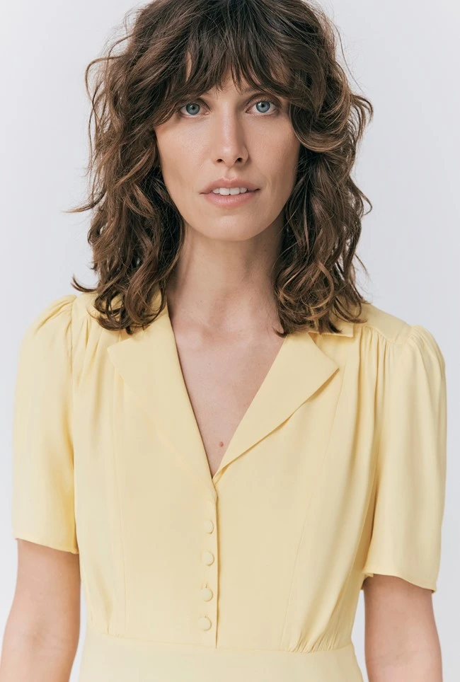 - The Blair lemon midi tea dress exudes timeless elegance with a vintage-inspired charm. Crafted in a beautifully nostalgic lemon yellow hue, its straight panelling offers a sleek and refined silhouette. A graceful v-neck, accented by a vintage-style collar and values in the same shade for seamless harmony, adds a touch of character, while the bias-cut skirt drapes effortlessly for a flattering finish. Short cuffed sleeves provide a polished touch, making this a versatile piece designed to stand the test of time.