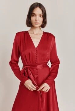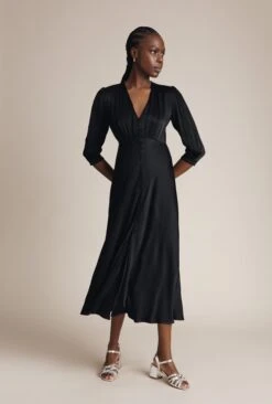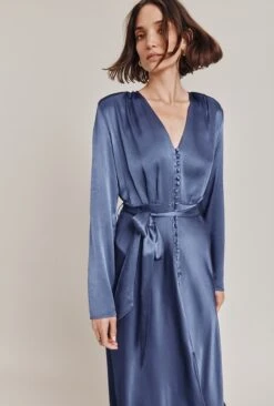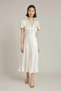 Vintage-like in silhouette and style, the Delphine in buttermilk is a timeless design. Cut into a gentle V-neck, its button-through front gives way to a split to create movement whilst walking and to showcase your choice of shoes and finishes with a train hem. Gathered detail around the shoulders and under the bust adds to its feminine appeal. Made from heavy satin fabric obtained from sustainable sources, it is cut on the bias for a flattering fit. Delphine is an occasion-wear must-have and would make a perfect bridesmaid dress.