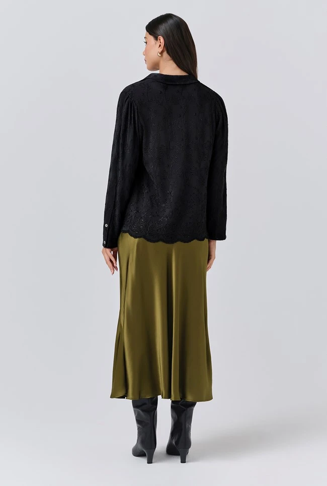 - Make Emily your go-to blouse this season. Designed with a relaxed camp collar neckline and featuring all-over cutwork embroidery, shell values, and a delicately scalloped hem, this understated but beautifully detailed blouse is a welcome addition to your autumn/winter wardrobe.