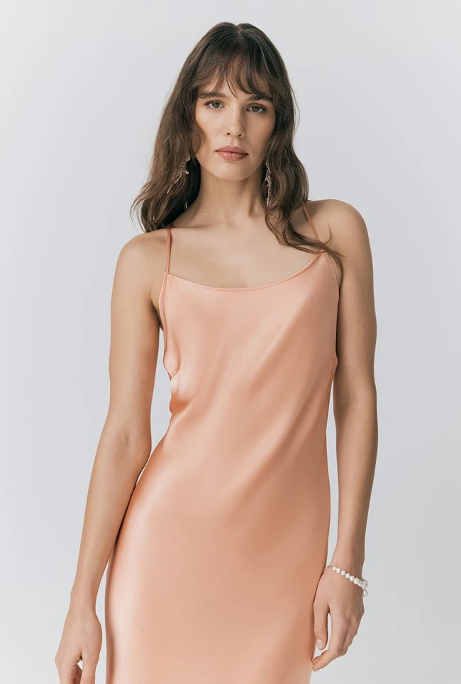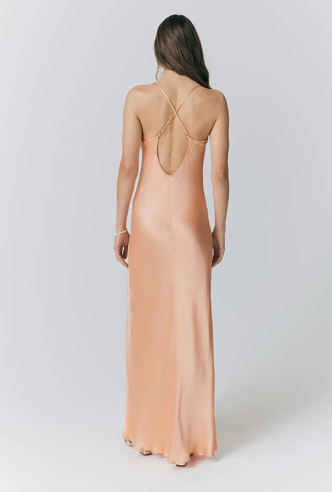 - Sophisticated yet sensual, Kallie is a peach bias-cut satin slip maxi dress with all the hallmarks of our signature slip dresses. Featuring adjustable spaghetti straps that cross at the back and a subtle scoop neck, this simple yet elegant style is the perfect option as a bridesmaid dress that can be styled up or down as wished.