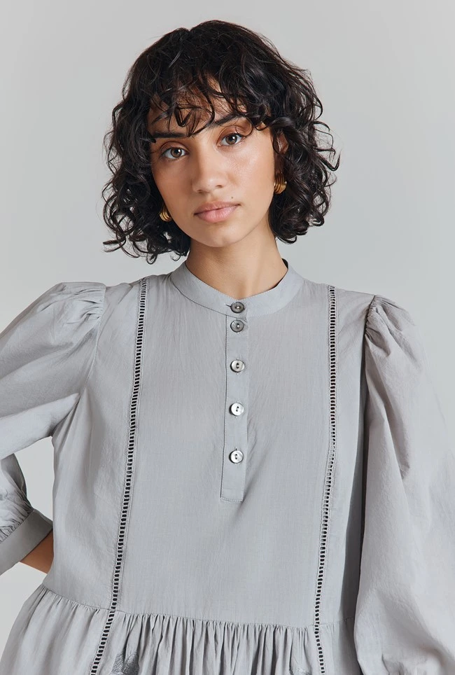 - We love the ease of Nova, a midi shirt-style dress in soft cotton, and so will you. Cut for a loose fit and silhouette, it features ¾ blouson sleeves, gathering at the waist for volume in the skirt, ladder trim and beautiful floral embroidery on the front. Fully lined for ease of wear, with side pockets for practicality. An all-seasons dress you’ll come to rely upon.