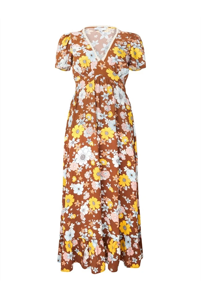 - A celebration of nostalgic charm, the Palmer Dress effortlessly channels 70s-inspired elegance. Cut from lightweight fabric that moves with you, this midi features a subtle V neckline adorned with a soft lace trim for a touch of romance. Delicately gathered sleeves lend a feminine silhouette, while the empire waistline gently cinches to flatter the figure. Finished in a dreamy, retro print, it’s a timeless piece that feels as effortless as it looks.