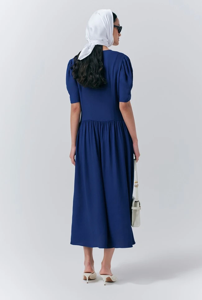 - Elegant with a touch of nostalgia – the Peony Dress channels 1930s-inspired glamour in a wearable, modern silhouette. Featuring a flattering V neckline and gently puffed sleeves, it’s defined by a soft drop waist that skims the figure before falling into a fluid skirt. A contrast bow detail at the front adds a feminine twist, balancing vintage influence with a fresh feel. Perfect for late-summer occasions and early autumn events, Peony pairs beautifully with everything from sandals to ankle boots.