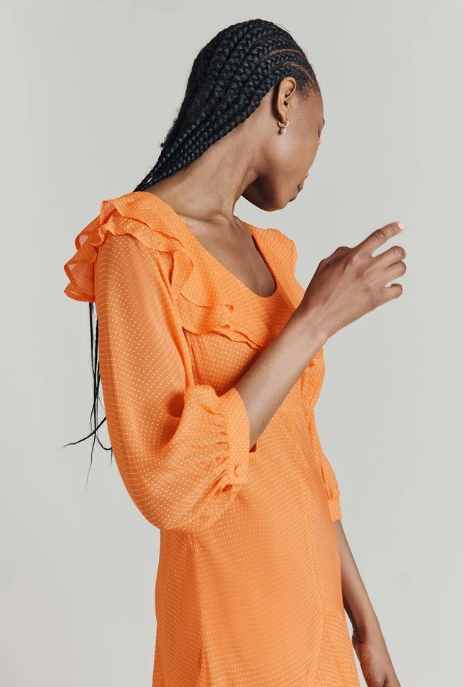 - A true showstopper, Poppy is one of our favourite dresses of the season. From the flattering bias cut to the subtle polka dot print, there’s a multitude of reasons to add her to your collection of wear-forever dresses. Featuring a scoop neckline edged with a wide double frill, a curved empire-line seam under the bust and ¾ blouson sleeves. Made from and lined with garment-washed viscose for a soft handle. Concealed side-zip fastening.
