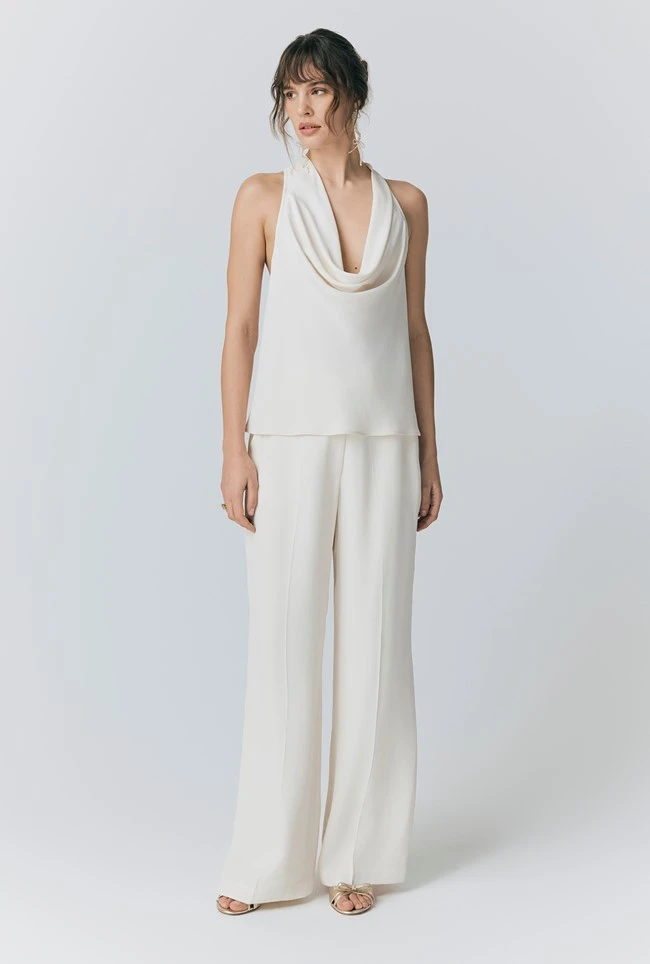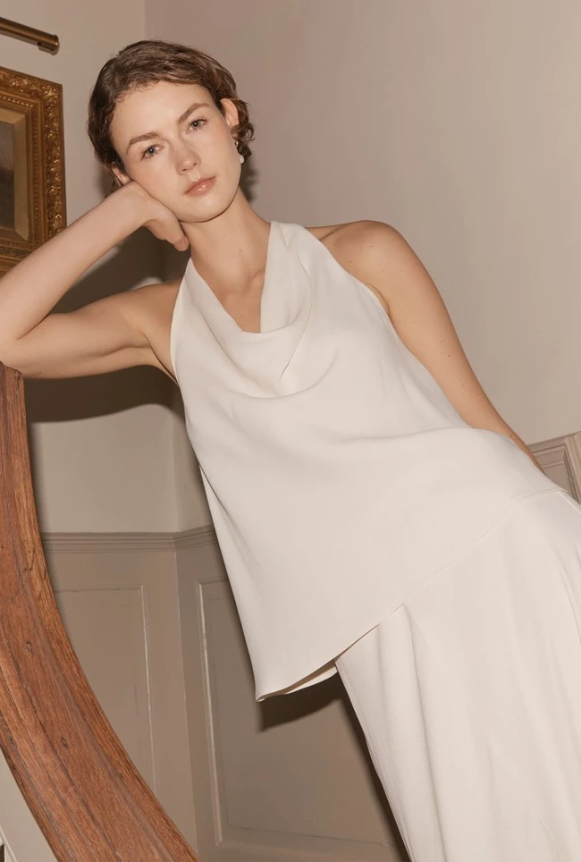 - Look to Sabine for an alternative bridal look or a showstopping occasion top. Adjustable, with a beautiful open back detail, Sabine is an ivory white satin cowl neck blouse that can be made higher or lower; she’s a showstopper whether paired with a skirt or trousers.